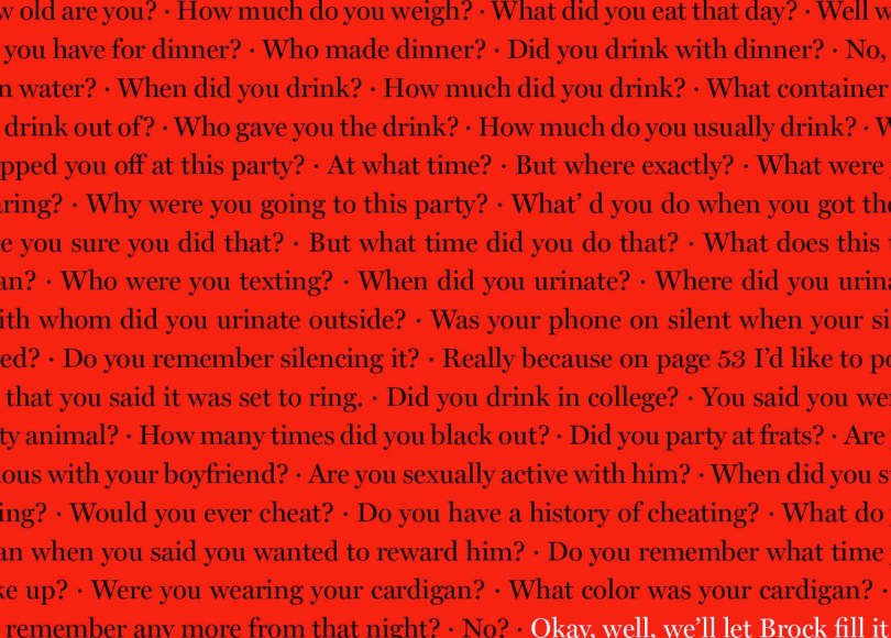Flitting listlessly through my timeline, I was arrested and perplexed by this wall of interrogation on a red background. Turns out it’s the narrowed, pointed questions directed at the woman sexually assaulted by Brock Turner, during a harrowing rape trial.